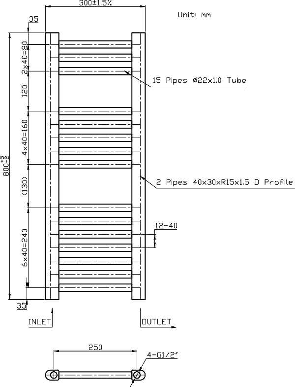 Horizontal Tubes: 15 (Round 22mm Diameter)