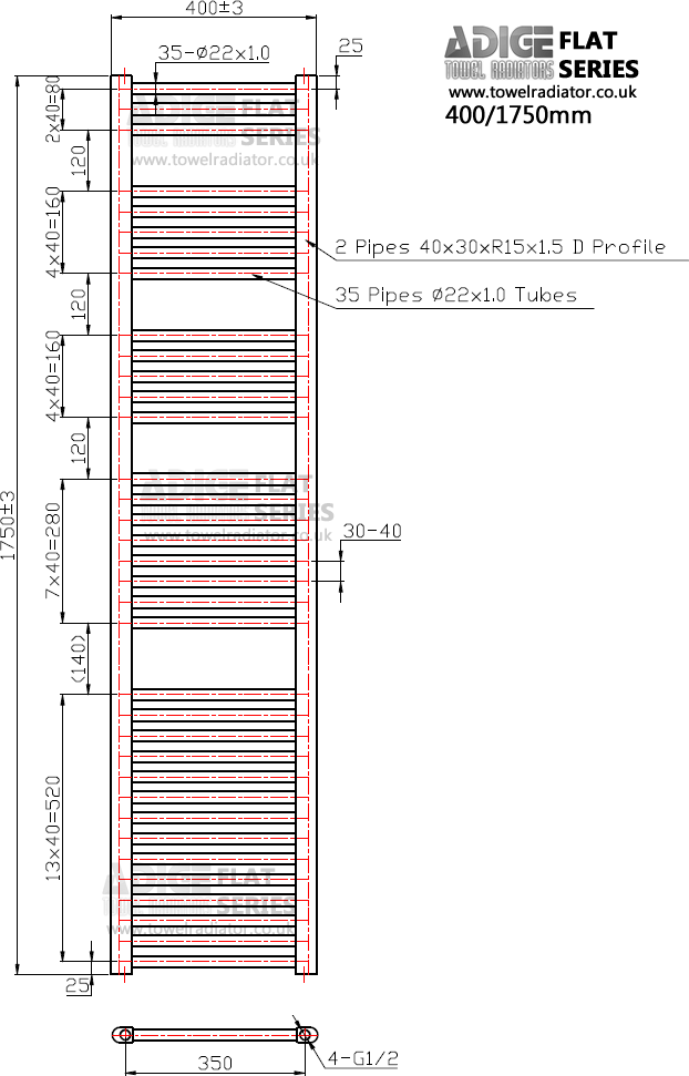 This space-efficient 400mm wide towel rail combines a tall & slim 1750mm profile with impressive heating performance. Featuring 35 horizontal anthracite tubes (22mm diameter), it delivers powerful warmth at 623 Watt - 2126 BTU/h @ Delta 50, making it ideal for bathrooms where vertical space is at a premium. The understated anthracite finish ensures it blends seamlessly with contemporary décors.