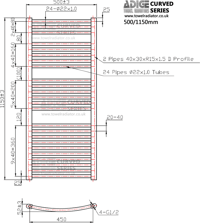 500mm(W) × 1150mm(H) | This curved towel radiator combines elegant design with practical heating. The chrome-plated finish provides durability and shine, while its 403W output (1374 BTU/h @ Delta 50) delivers efficient warmth. With 450mm pipe centres, it's easy to install in most bathrooms, offering both style and function.