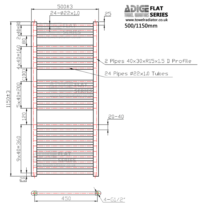 Towel rail technical drawing 500/1150mm flat models