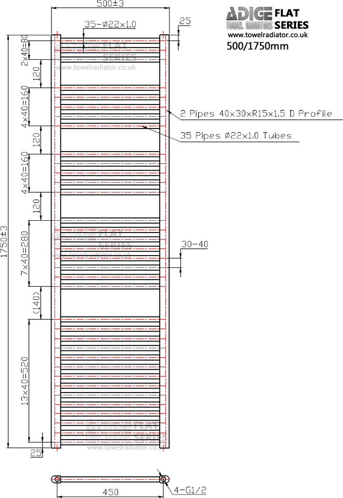 Towel rail technical drawing 500/1750mm flat models