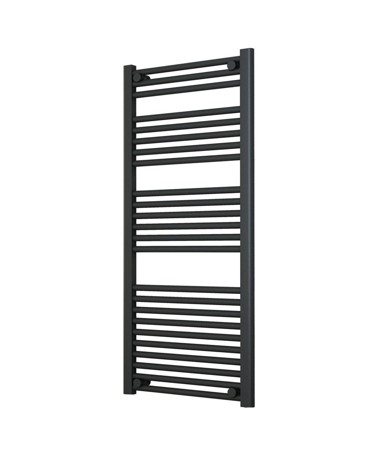 Known as the “most common size”, this 500mm wide and 1150mm high anthracite finish towel radiator is capable of heating most average size bathrooms with its impressive 1728 Btu/h heat output based on delta T50 that is equivalent to 506watts. With 24 horizontal crossbars, all of which are round shape and 22mm in diameter, the water intake for this radiator is 5.28 litres.