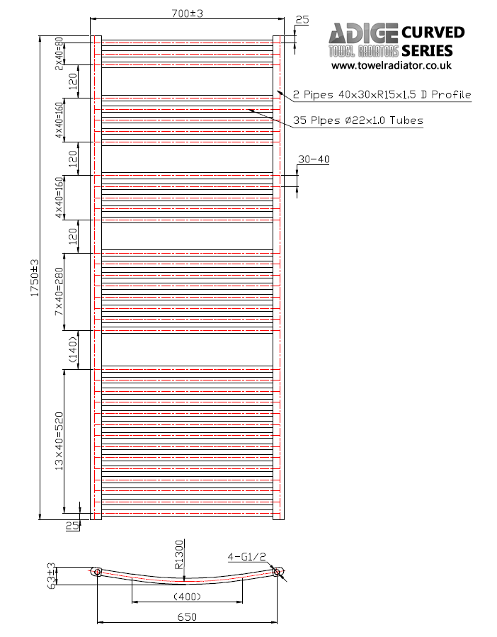 *Discontinued* 700mm wide and 1750mm high chrome curved heated towel rail with 791 Watt - 2700 BTU/h @ Delta 50.