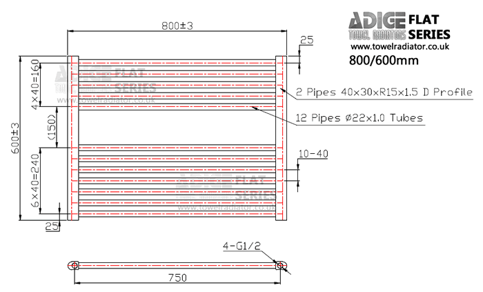 800mm(W) × 600mm(H) | This steel horizontal towel radiator combines an 800mm drying span with space-saving 600mm height. The chrome-plated finish ensures durability while providing 304W heat output (1036 BTU/h @ Delta 50) - ideal for compact bathrooms where every centimetre counts.