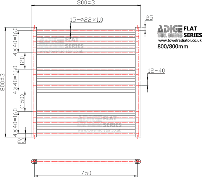 800mm(W) × 800mm(H) | As Adige's ultimate top-seller size, this chrome-plated towel radiator balances form and function perfectly. The 800mm square frame features a 5+5+5 tube layout delivering 385W output (1313 BTU/h @ Delta 50), offering generous drying space with timeless mirror-like appeal.