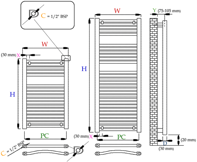 *All towel radiators are supplied with 4 adjustable brackets enabling you to adjust the distance between the wall and the centre of the radiator (centre of the air vent - bleed valve) to a value between 75mm and 95mm.