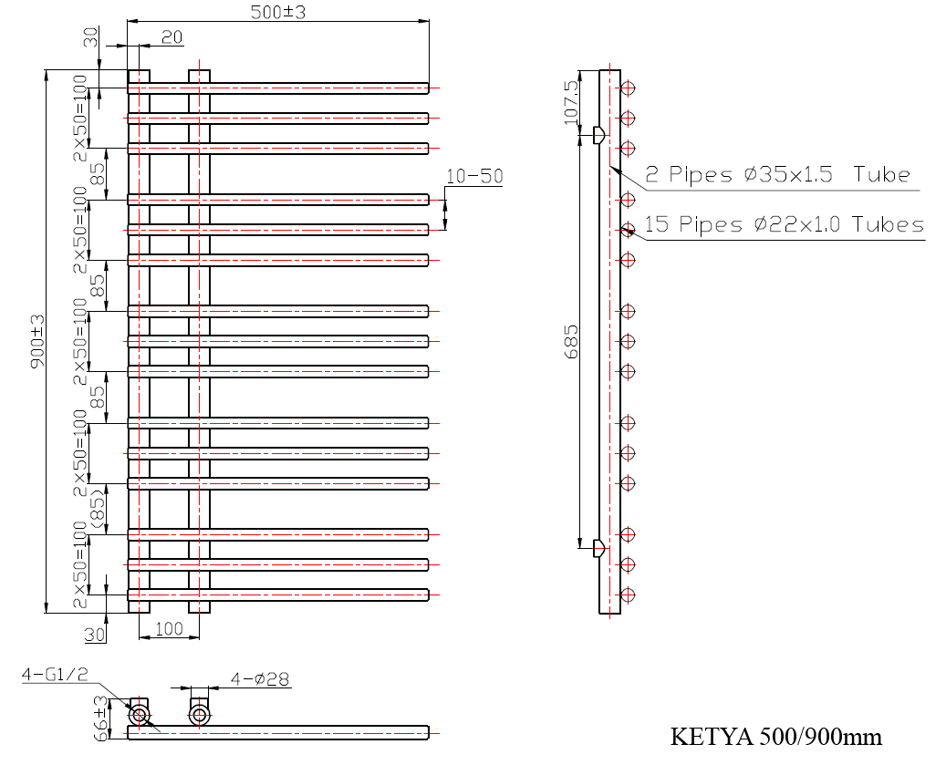 500mm(W) × 900mm(H) | The KETYA open-ended towel radiator features a distinctive round tube design with a chrome-plated finish, delivering 291W heat output (994 BTU/h @ Delta 50). Its 3.80-litre water capacity ensures efficient heating, while the 900mm height provides practical drying space. This designer chrome bathroom radiator combines elegant form with reliable function for modern interiors.