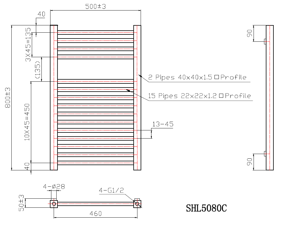 SAHLA 500/800mm Designer towel radiator technical drawing