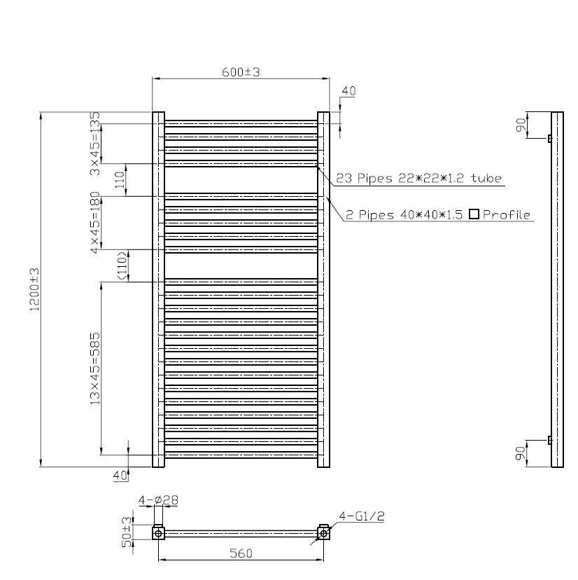 *Discontinued* 600mm wide and 1200mm high square tubed chrome plated ladder style flat towel radiator with 566 Watt - 1932 BTU/h @ Delta 50.