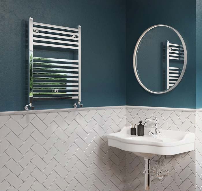 500mm wide and 690mm high chrome square tube designer towel radiator with 224 Watts - 764 BTU/h @ Delta 50.