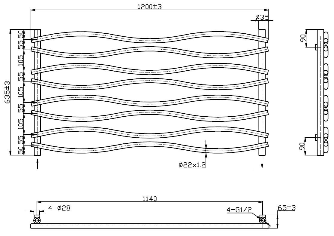 WAVE 1200mm wide 635mm high designer towel radiator technical drawing